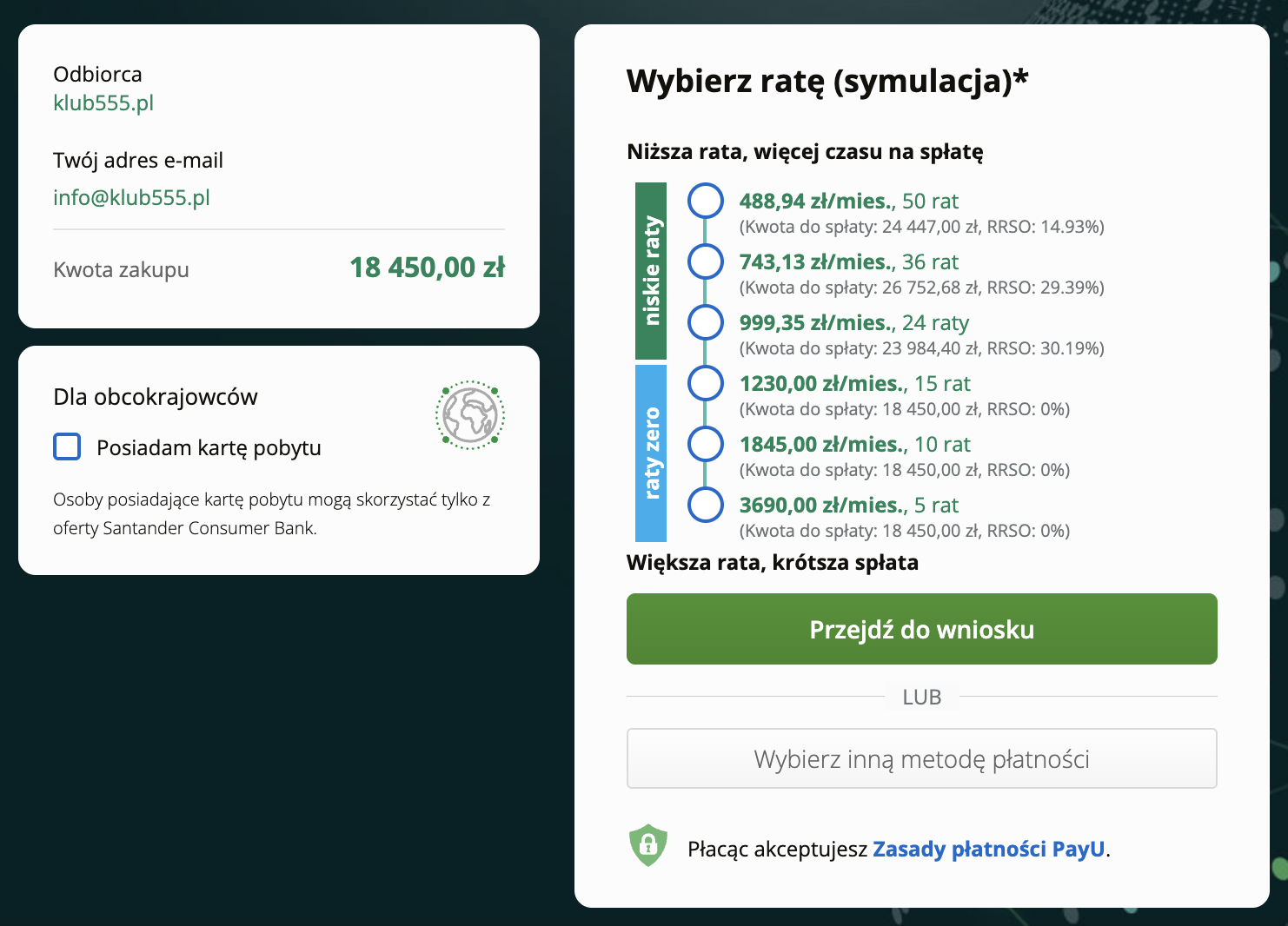 Jednorazowo lub w ratach przez płatności PayU (do 15 rat 0% lub do 50 rat z niskim oprocentowaniem). Aktualna kalkulacja wygląda następująco: