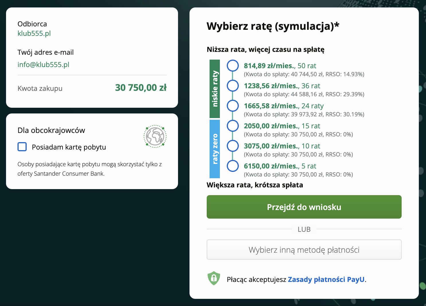 Jednorazowo lub w ratach przez płatności PayU (do 15 rat 0% lub do 50 rat z niskim oprocentowaniem). Aktualna kalkulacja wygląda następująco: